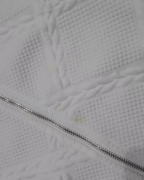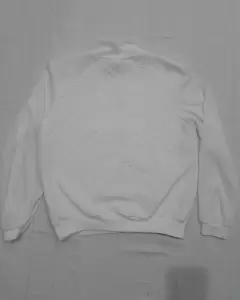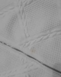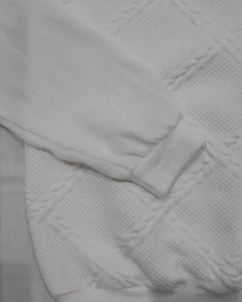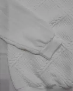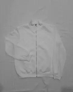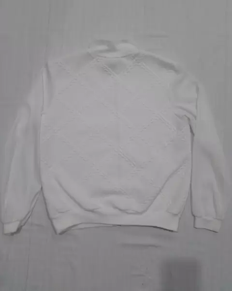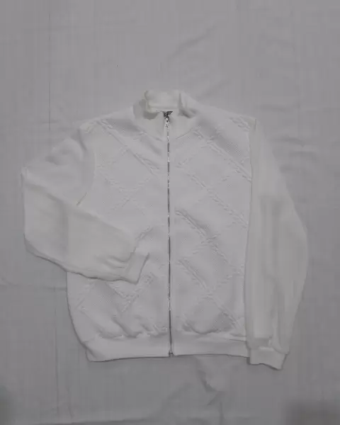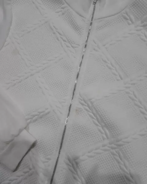 Chamarra blanca, fresca, la tela es ligera y agradable al tacto con una textura de rombos trenzados, las mangas son lisas y con una ligera transparencia, se encuentra en buenas condiciones, su único detalle son unas ligeras manchas en la parte delantera.