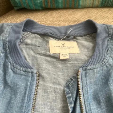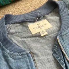Chamarra Bomber AE mezclilla. Hermosa chamarra nueva tipo bomber con bolsillos al frente. Muy ligera para estos climas es ideal, se ve súper linda y es fresca ✨☀️ esta nueva y es talla S