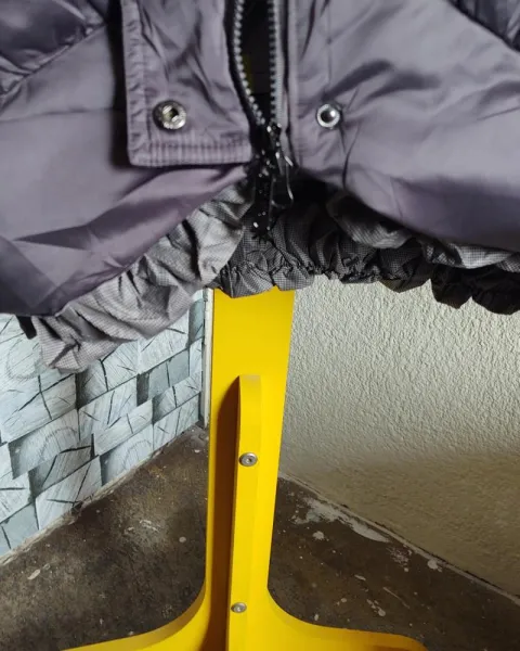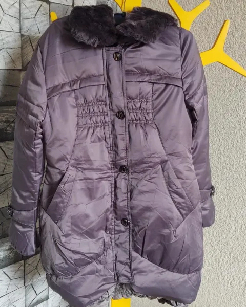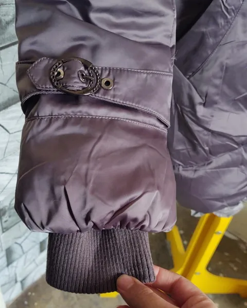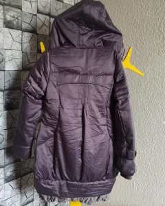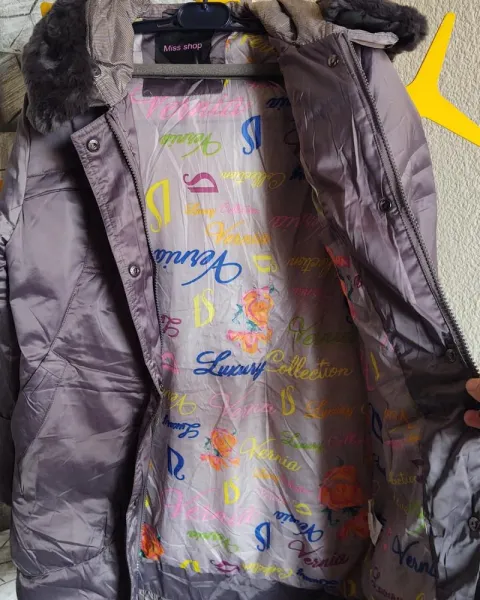 Color plateado brilloso, olanes en parte inferior, peluche en gorro desmontable y muy calientita. Diseño original y único