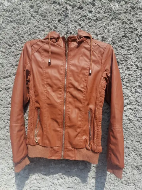 Chamarra color café de piel sintética con afelpado completo y capucha