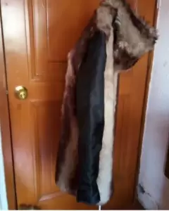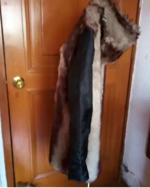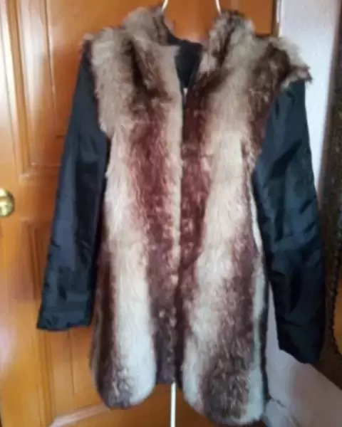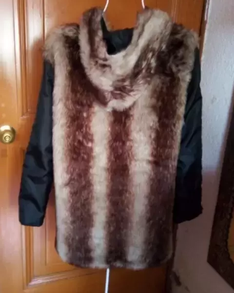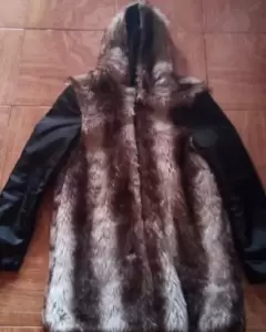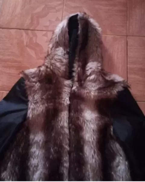 Chamarra café, negro beige. Chamarra con cierre al frente para cerrar con capucha integrada de peluche sintético color café con beich, mangas y parte de adentro color negro poliéster