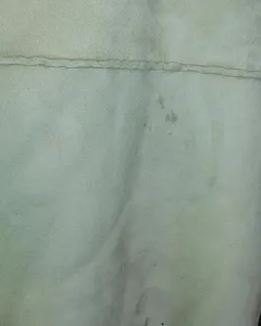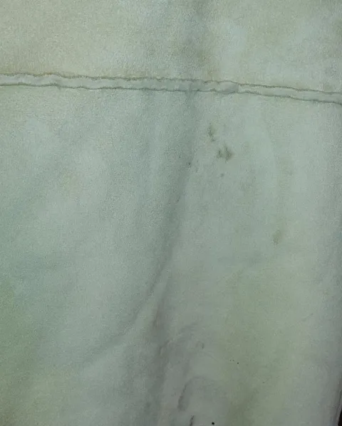 Chamarra tipo piel y por dentro aborregada. Muy calientita, no traspasa el frío.Tiene manchas que se parecían en una foto. Es necesario enviarla a la tintorería.