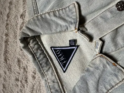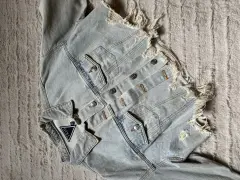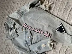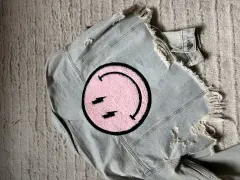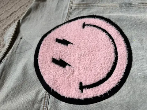 Chamarra carita feliz. Chamarra corta de mezclilla con detalle de parche carita feliz, corta de la parte de la cintura
