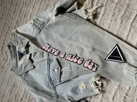 Chamarra corta de mezclilla con detalle de parche carita feliz, corta de la parte de la cintura