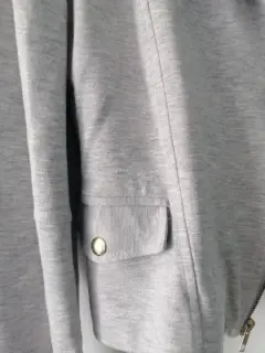 Tela gruesa, tipo saco, con cierre y bolsas a los costados con broche