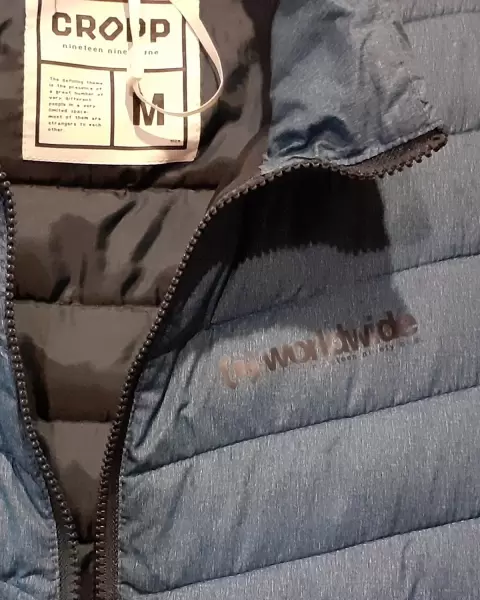 Bolsas grandes interiores y boksas exteriores con cierre en ambos lados. Cuello alto. Sofisticada combinable comprada en Europa de United Kingdom. Mide 45 cm de hombro a hombro, 52 cm ancho, tipo impermeable tacto muy suave.