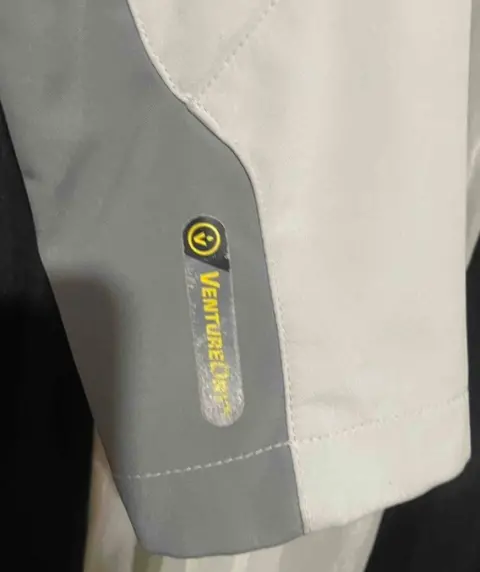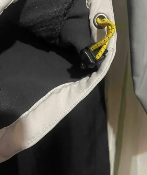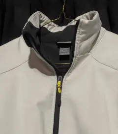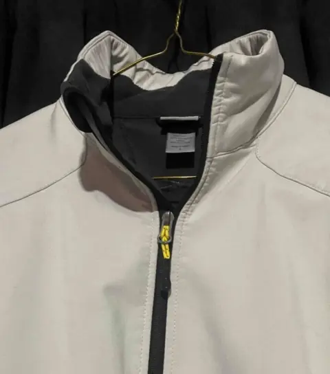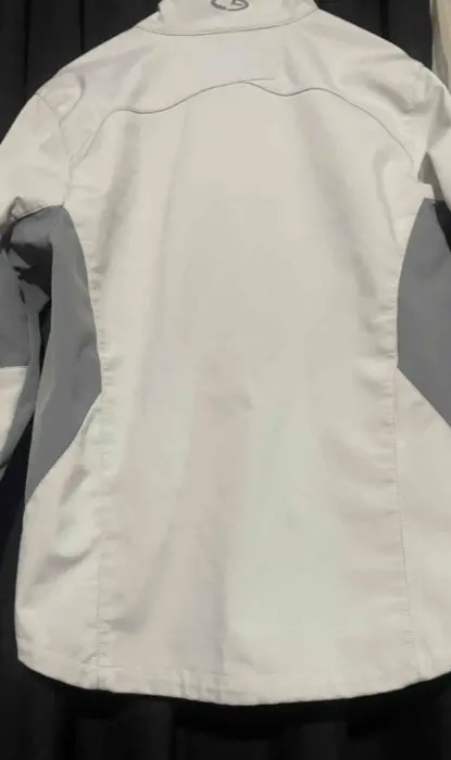 Chamarra gris claro con gris obscuro, trae jaretas para ajustar en la parte de enfrente trae un punto de tinta q no afecta en nada y casi no se nota