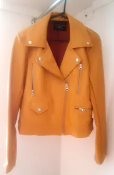 Hermosa chamarra color mostaza, talla mediana, llega a la cintura, poco uso, imitacion piel