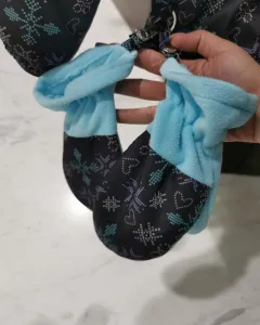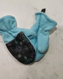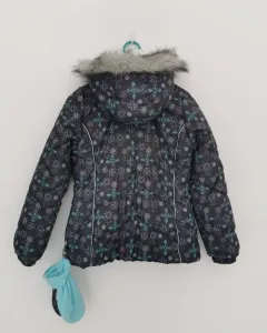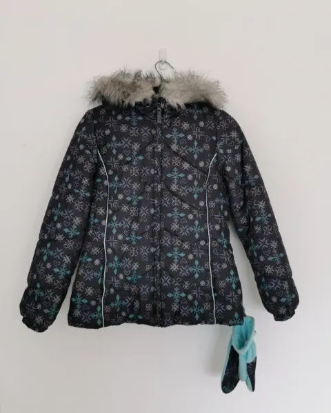 Chamarra estampada con pequeños motivos de copos. La chamarra tiene capucha con pelo. Bolsillos de jareta al enfrente para meter las manos. El forro es tela afelpada color acua. Tiene resorte en los puños. Incluye un par de guantes a juego. Talla 14/16 juvenil o XXS de mujer.