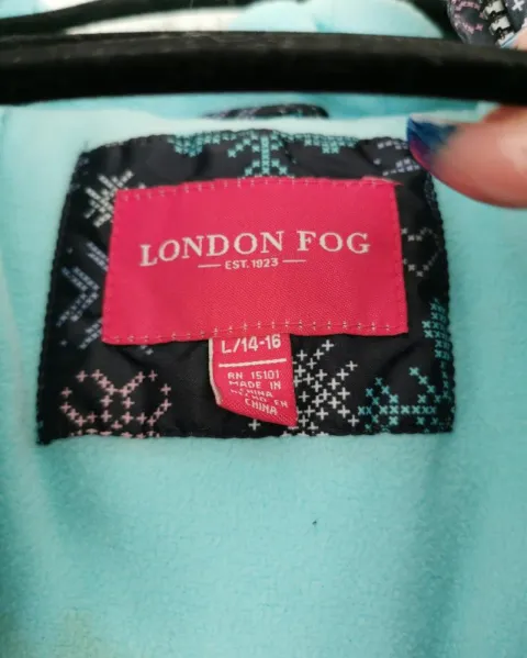 Chamarra con capucha London Fog. Chamarra estampada con pequeños motivos de copos. La chamarra tiene capucha con pelo. Bolsillos de jareta al enfrente para meter las manos. El forro es tela afelpada color acua. Tiene resorte en los puños. Incluye un par de guantes a juego. Talla 14/16 juvenil o XXS de mujer.