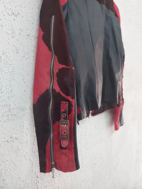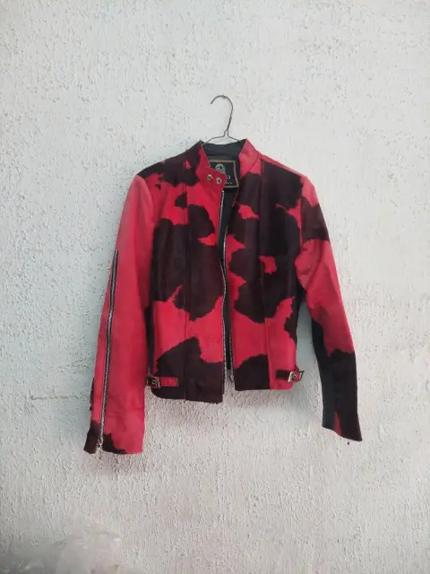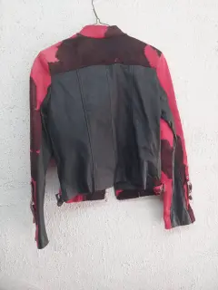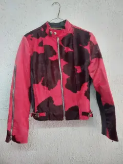 Chamarra de cuero. Es una chamarra de cuero con un estampado en rojo y negro de animal print en la parte de enfrente tiene un cierre y se abotona del cuello,la manga cuenta con un cierre que abarca desde el puño del brazo hasta el codo el cierre se puede abrir , en el costado tiene un detalle de un como sinturon.-En la parte de adentro de la chamarra cuenta con un bolsillo interno hecho con la misma tela del forro la chamarra tiene solo una compostura en el forro de la manga derecha espero les sirva esta descripción de la prenda si no pueden dejar un mensaje y los responderé lo más pronto posible 🙂