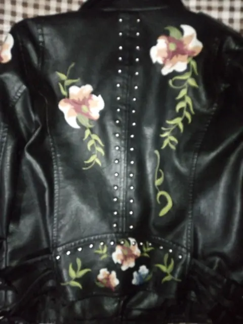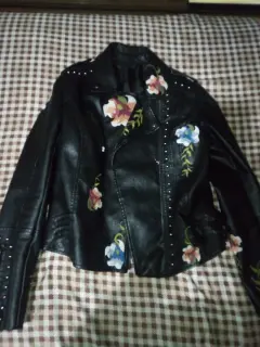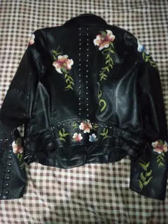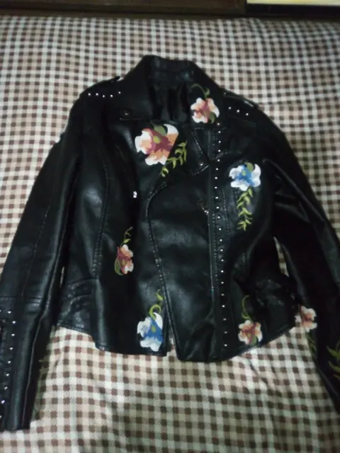 Chamarra de cuero negra bordada. Chamarra de cuero marca Shein, talla S, sin ningún detalle no tiene etiqueta, sólo tiene tres puestas.