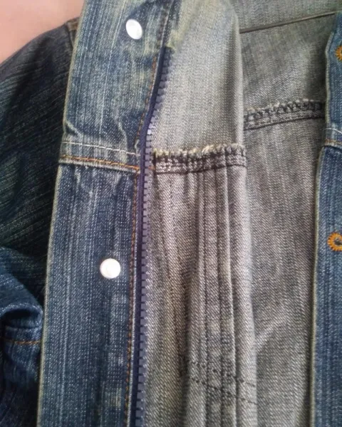 Chamarra de mezclilla en tono deslavada, tiene botones enfrente, abajo y en las mangas, tiene bolsas enfrente y ademas trae bolsas en la parte de adentro, asi como con cierre para mejor ajuste.