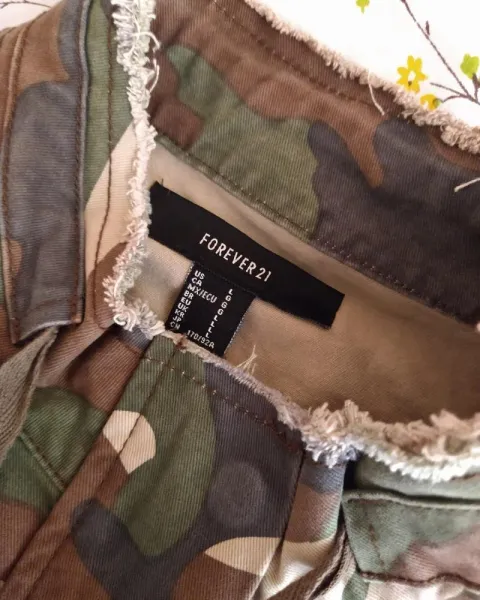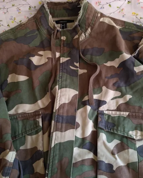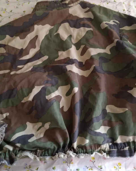 Chamarra de mezclilla camuflajeada. Es de manga caída , viene muy amplia y tiene un lazo para ajustar en la cintura