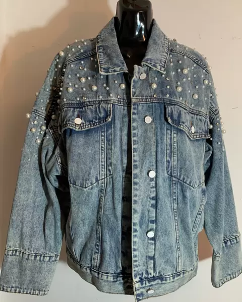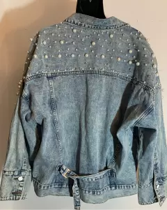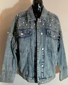 Chamarra de mezclilla con perlas y pedrería. Chamarra overside de mezclilla deslavada bordada con bolsillos enfrente y laterales largo a cadera