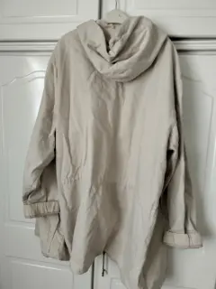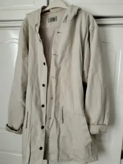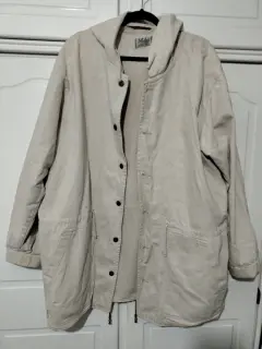 Chamarra de mezclilla larga 55 CM de hombro de largo 90 CM largo manga 64 CM con gorro el la parte superior y trasera cinta de ajuste a la cintura 2 bolsas y botones en la parte frontal