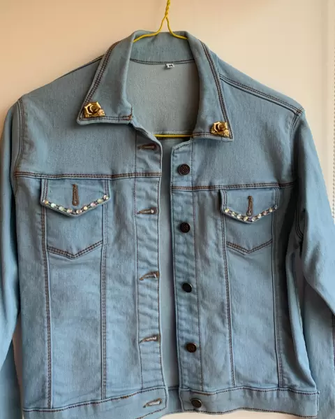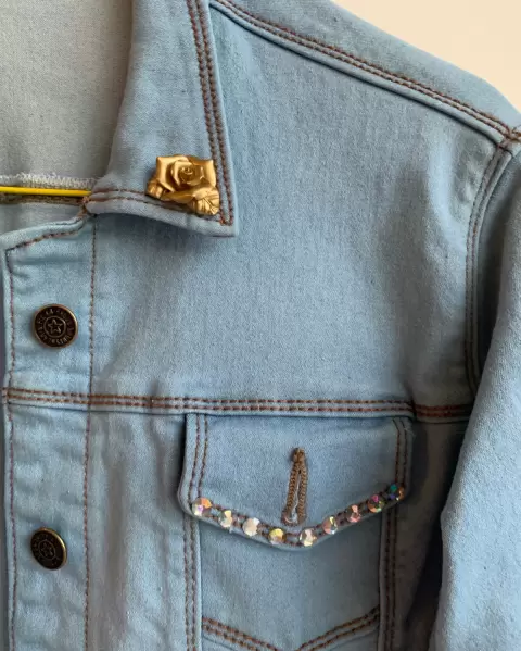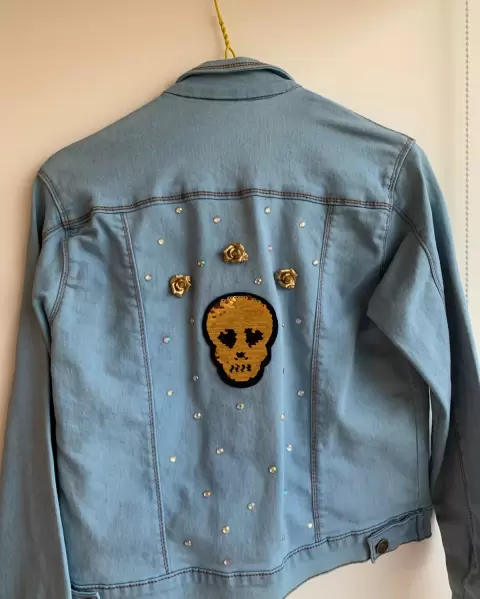 Chamarra de mezclilla con parche de calavera y rosas doradas!