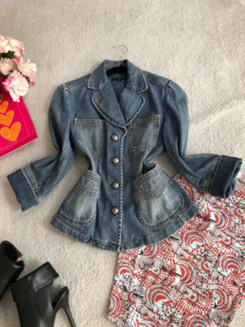Hermosaa chaqueta de mezclilla estilo vintage, manga 3/4, con bolsas al frente, botones de metal, Medidas: busto 47 cm. Hombros 38 cm. Largo 58 cm. Súper bonita!