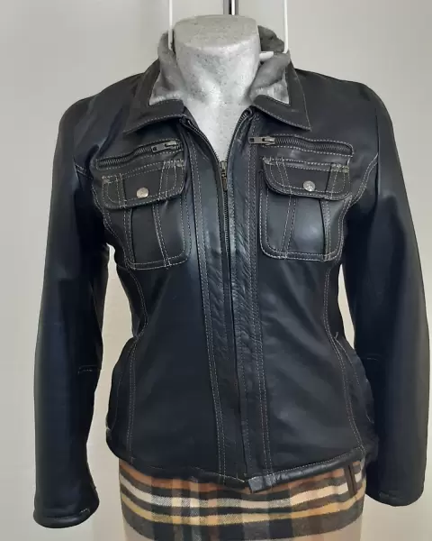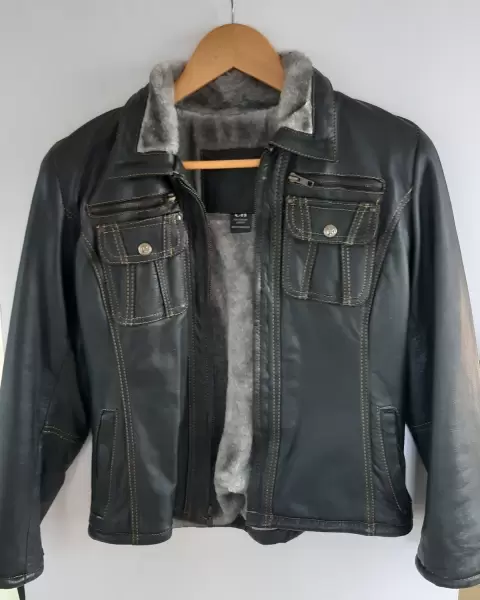 Moderna chamarra de piel, negra con costuras cafe, en excelentes condiciones talla ch, con forro de peluche, muy calientita