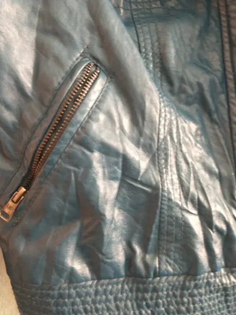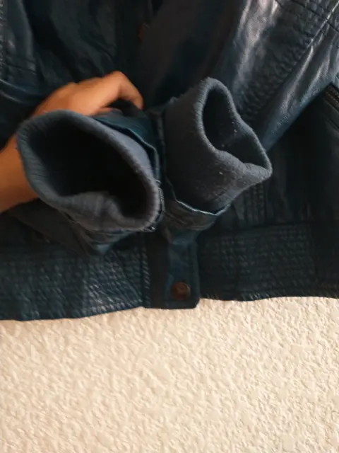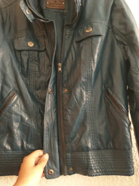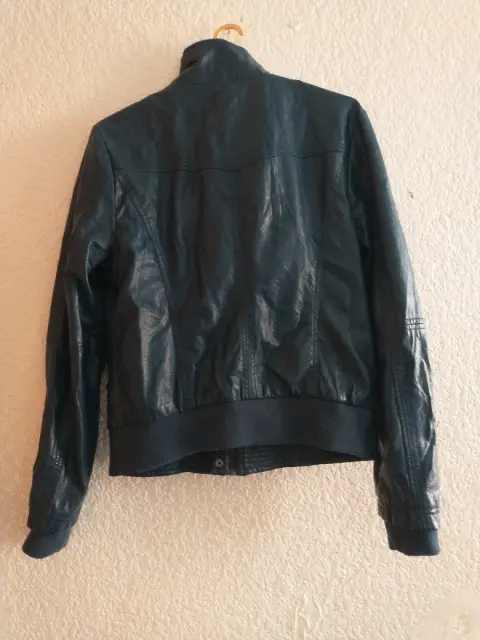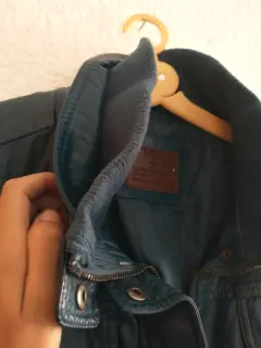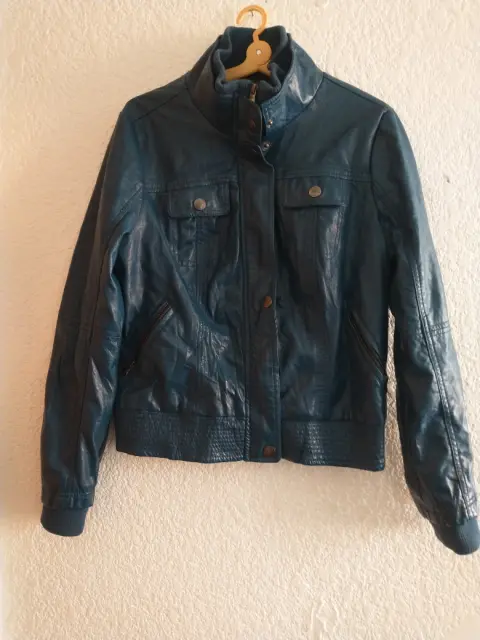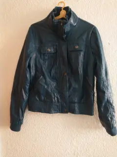 Chamarra de piel color verde con azul Dice talla G pero da mejor a una M Sin detalle , en exelente estado