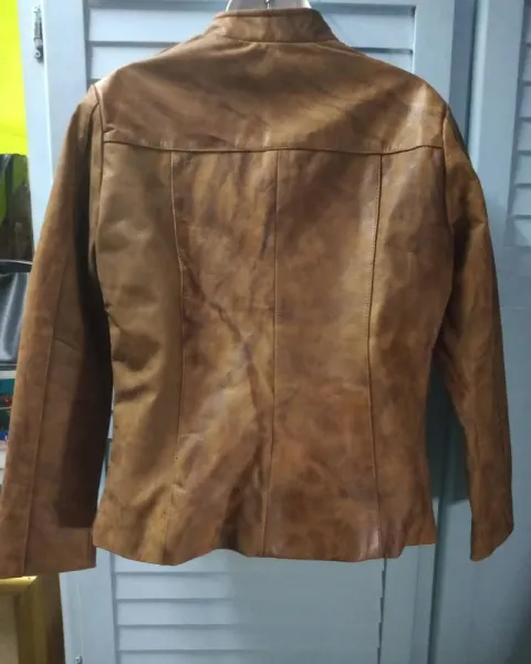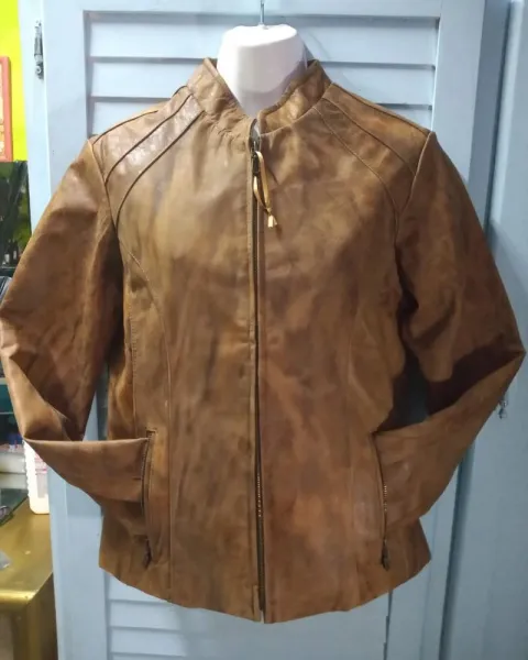 Chamarra de piel color camel, talla mediana. Con cierres en las bolsas.