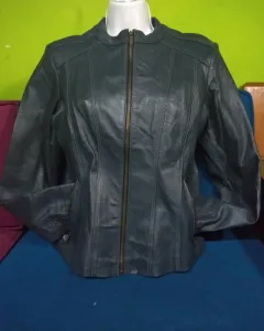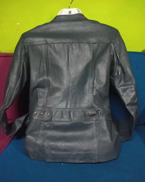 Chamarra de piel color gris, talla mediana, con cierres en las bolsas.