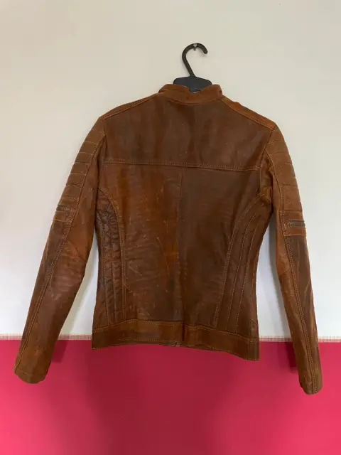 Es de piel café estilo vintage, talla xs, solo se usó una vez
