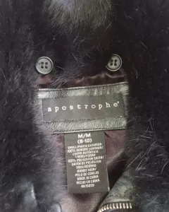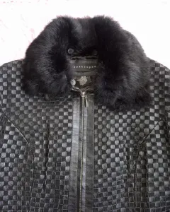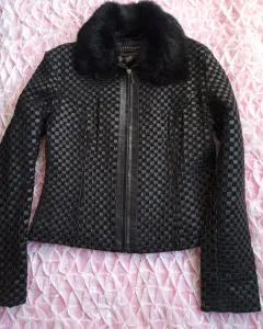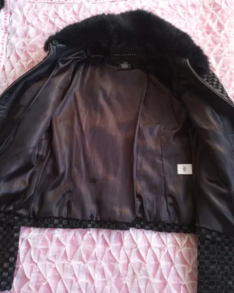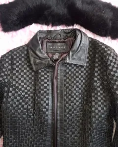 Chamarra de piel y pelo de conejo. Chamarra de piel entretegida con cierre y cuello de pelo de conejo desmontable en color negro, forro de satín.
