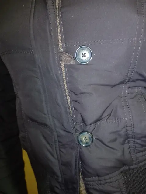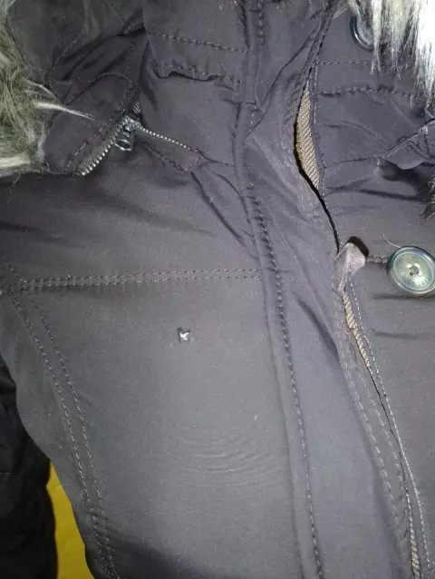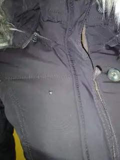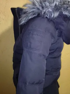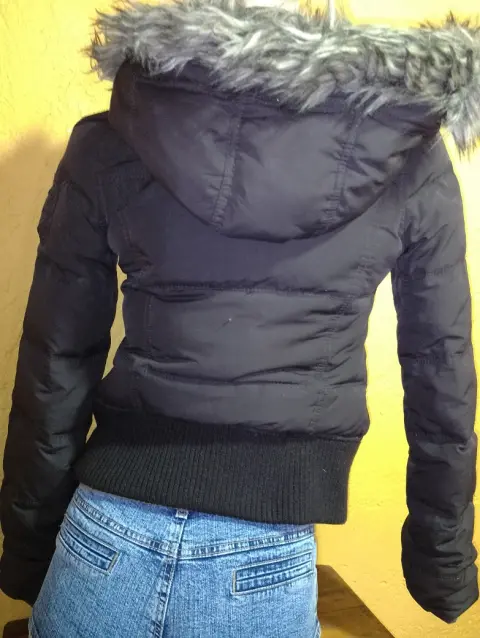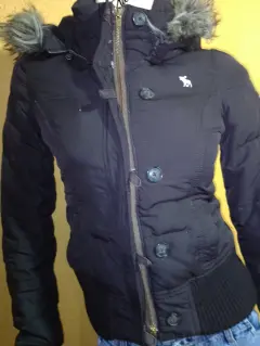 Chamarra Abercrombie de pluma, es tipo bomber, es del departamento KIDS, equivalente a talla XS. El único detalle se muestra en una de las fotos
