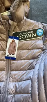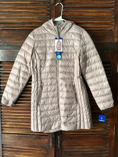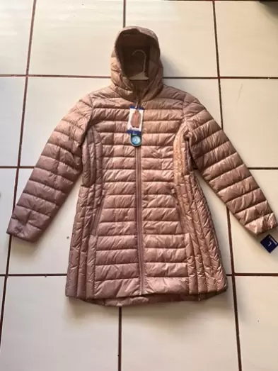 Chamarra de plumas. Chamarra acolchada de plumas, ligera y larga, talla L, color rosa palo, nueva!
