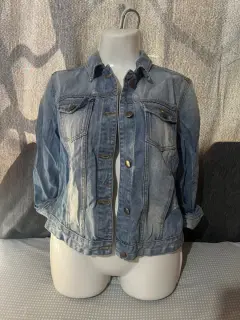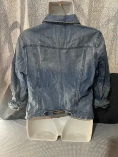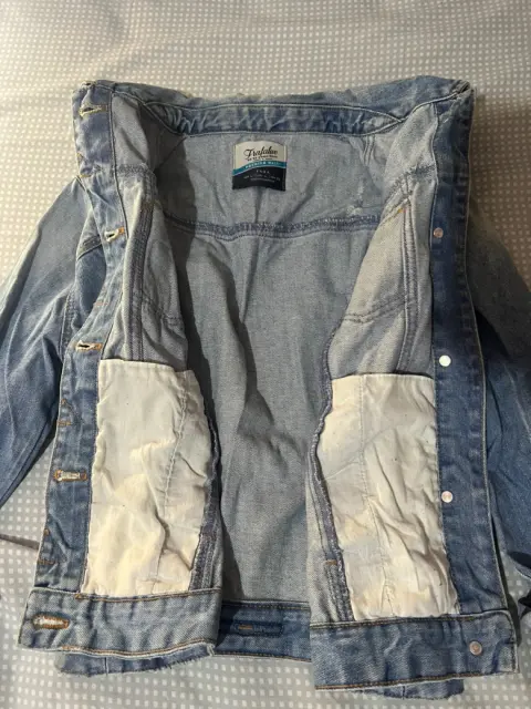 Chamarra Denim azul claro marca Zara línea Trafaluc la etiqueta dice L pero es en realidad para una chica talla XS medida de hombros 38 cm y largo 49cm