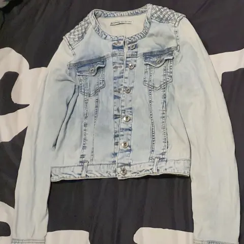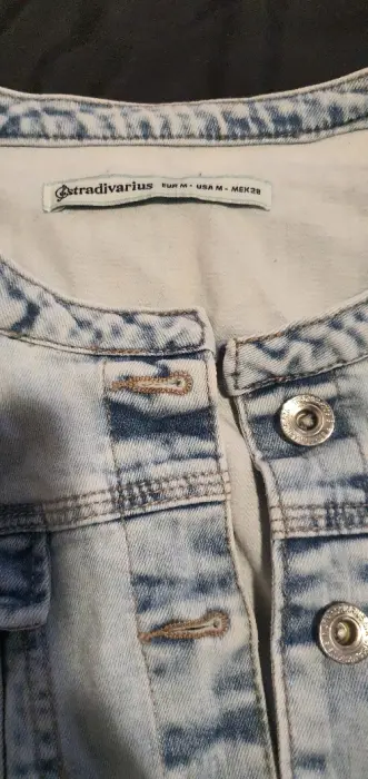 Chamarra Denim Stradivarius. Chamarra DenimTela rígida,delgada tipo Mezclilla deslavadaTiene detalles hermosos trenzadosUsada un par de veces