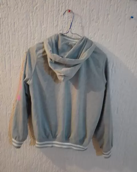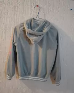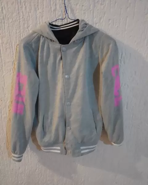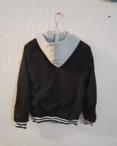 Es una chamarra tipo colegial , doble vista, por un lado es negra ,de poliéster, con franjas blancas en puños y cintura , por el otro lado es gris claro de algodón, su diseño está muy padre, te encantará.