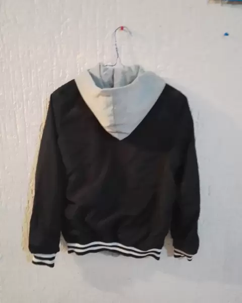 Chamarra doble vista tipo colegial. Es una chamarra tipo colegial , doble vista, por un lado es negra ,de poliéster, con franjas blancas en puños y cintura , por el otro lado es gris claro de algodón, su diseño está muy padre, te encantará.