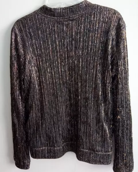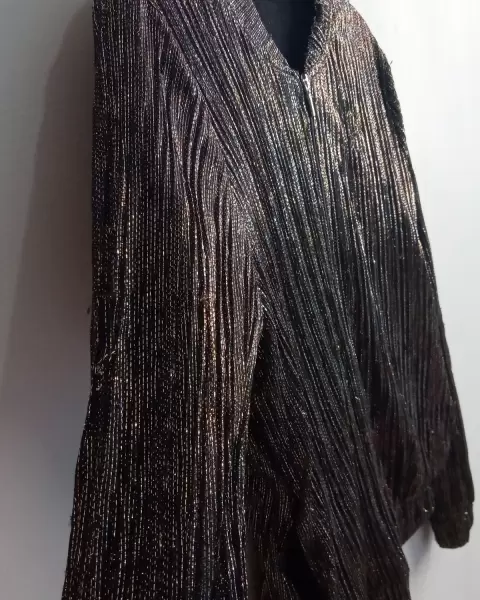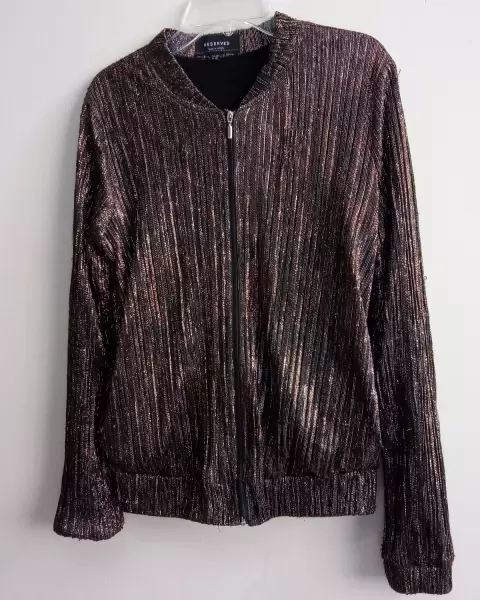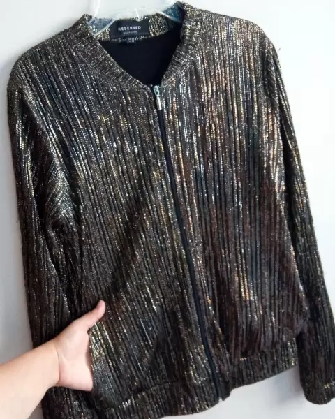 Chamarra dorado con plataedo. Chamarra plateada con dorada con cierre y bolsasDe uso, tiene algunos hilos jalados pero no se notaMarca ReservedTalla M