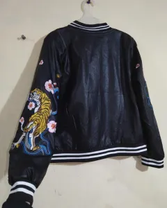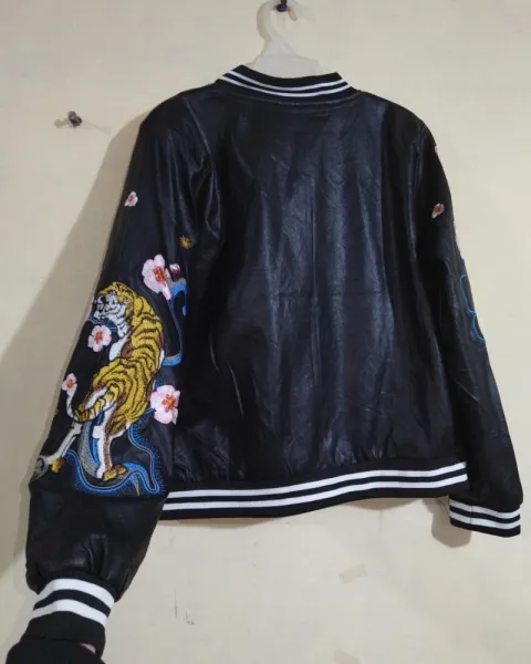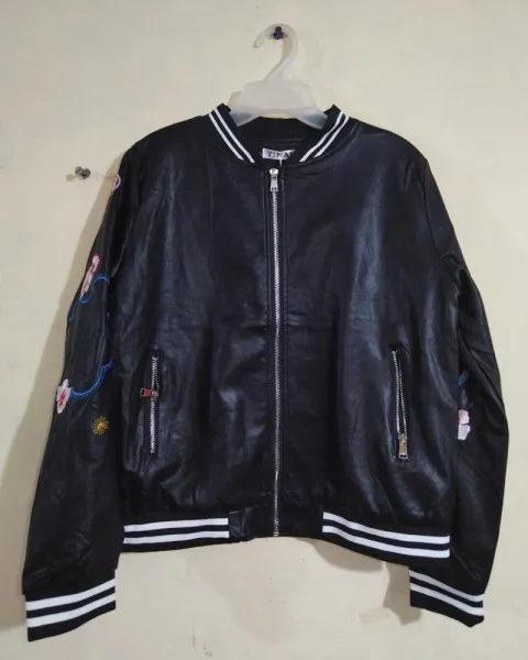 Chamarra efecto Piel. Chamarra Efecto Piel con aplicación en mangasColor negroIdeal para acompañar tu look Casual con jeansAmolda muy bien al cuerpo