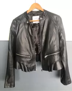 chamarra efecto piel. chamarra cuello redondo, corte peplum, con olán en las mangas!medidas axila a axila 44 cm, largo 54 cm , manga 65 cm