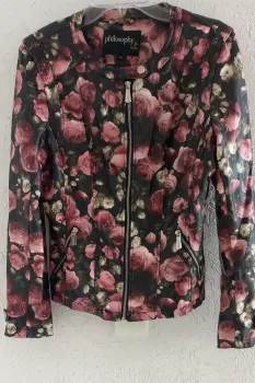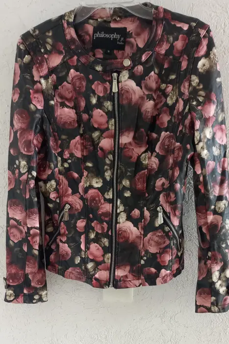 Chamarra floral. Chamarra negra floreado con tonos rosados y hojas verde olivo.