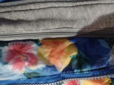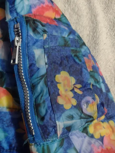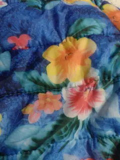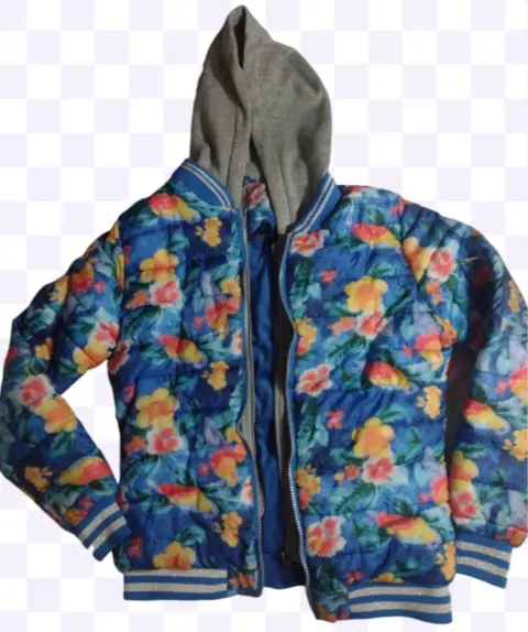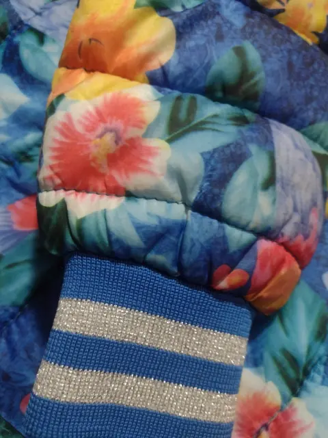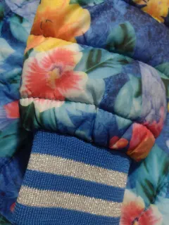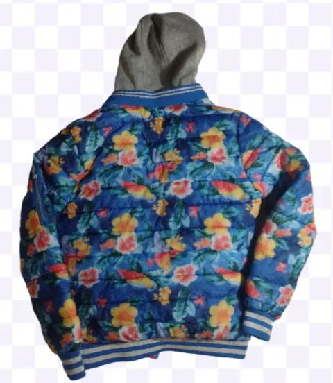 Chamarra floreada de dama. Chamarra floreada de Dama con gorro color gris , cierre en mangas, y franjas plateadas en mamgas