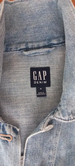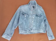 Chamarra GAP de mezclilla. Talla mediana.Tiene dos pequeñas bolsas en la parte superior en la parte de frente de la chamarra.Es abierta y si puede cerrar con los botones que tiene.