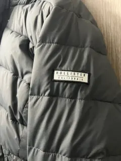 Chamarra HOLLISTER gris. Chamarra gris con borrega pachoncita súper calientita de cierre al frente y botones, trae gorro y bolsas al frente con cierre. Talla XL que puede quedar L