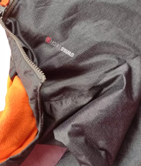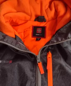 Chamarra unisex, impermeable, color gris oscuro con naranja, marca SwissTech, cuenta con tres cierres al frente, capucha, talla XL.