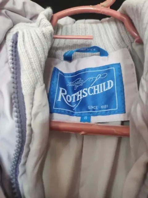 Bonita chamarra de frío para niñaTalla 8 Color morado Marca Rothschild Detalles: falta 1 botón , no afecta