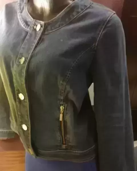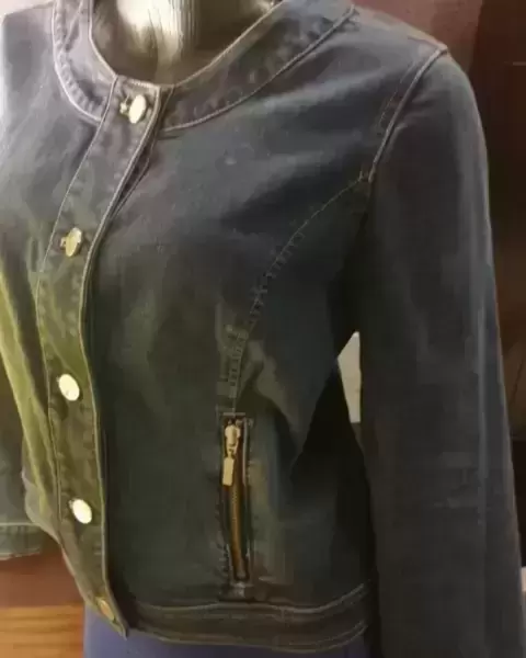 Marca: Chico'sTalla: Cero ( Chica)Color: azul deslavadoHerrajes, botones, cierres en color dorado, en perfecto estadoLargo total: 52 cms.Largo total manga: 59 cms.Ancho de axila a axila : 48 cms.No incluye faldaSe entrega sanitizado