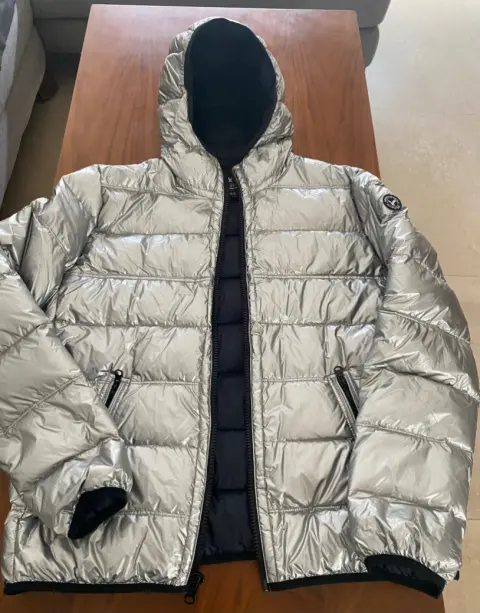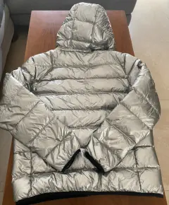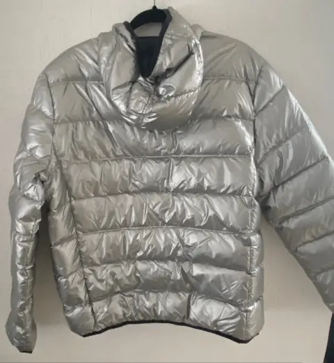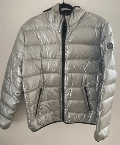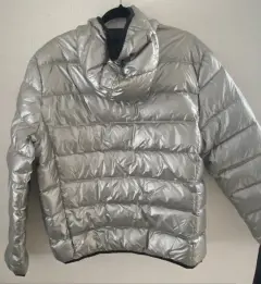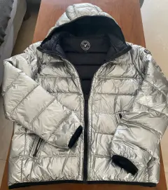 En tendencia! Chamarra metalizada color Plata, talla L, American Eagle con capucha. Es ligera pero abriga dora, ideal para tiempos de frío o lluvia.