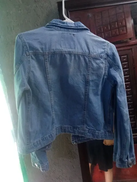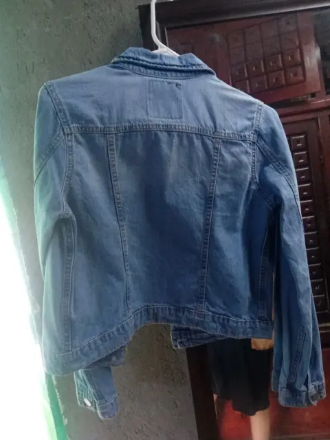Bonita chamarra de mezclilla azul claro la use una vez es talla chica está muy bonita y ligera 😊