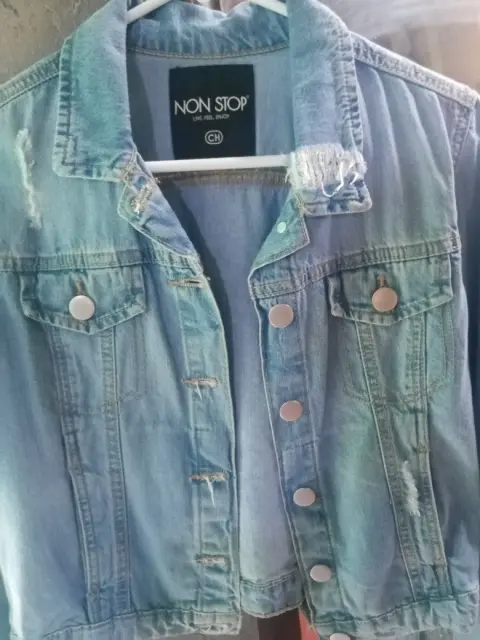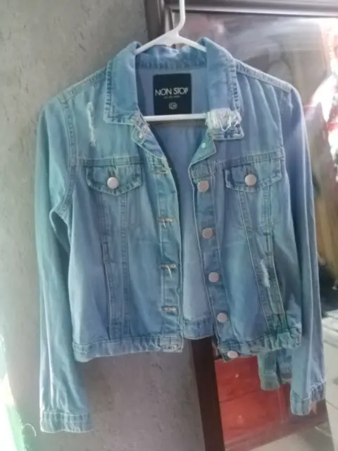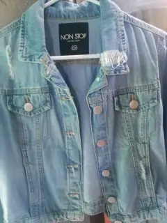 Chamarra mezclilla claro non stop. Bonita chamarra de mezclilla azul claro la use una vez es talla chica está muy bonita y ligera 😊