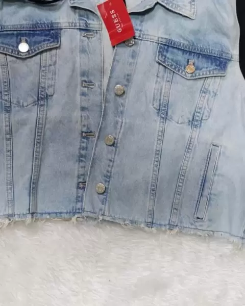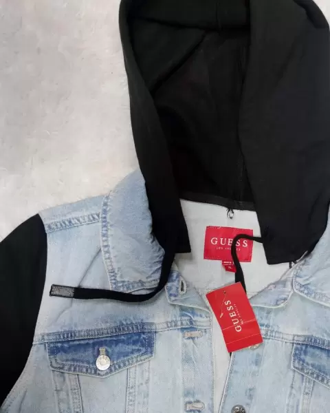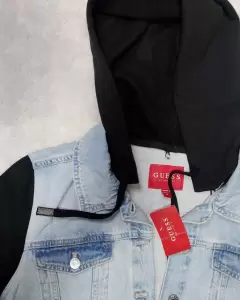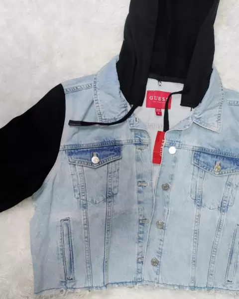 Chamarra Mezclilla Guess. Chamarra Mezclilla con mangas tipo sudadera, queda mejor a una talla L 58 cm de axila a axila y 49 cm largo