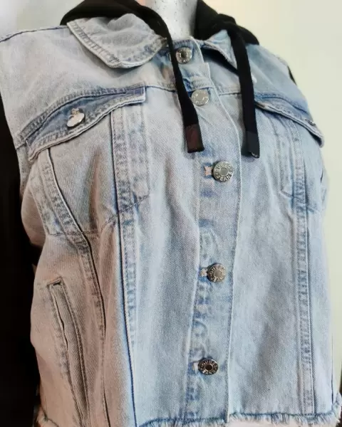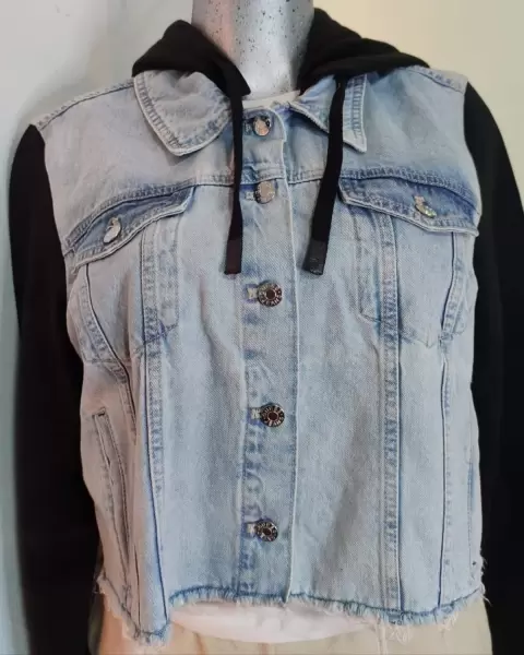 Chamarra Mezclilla con mangas tipo sudadera, queda mejor a una talla L 58 cm de axila a axila y 49 cm largo