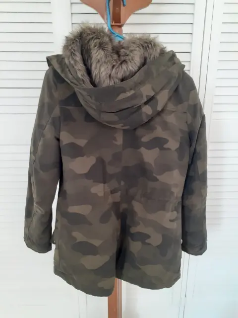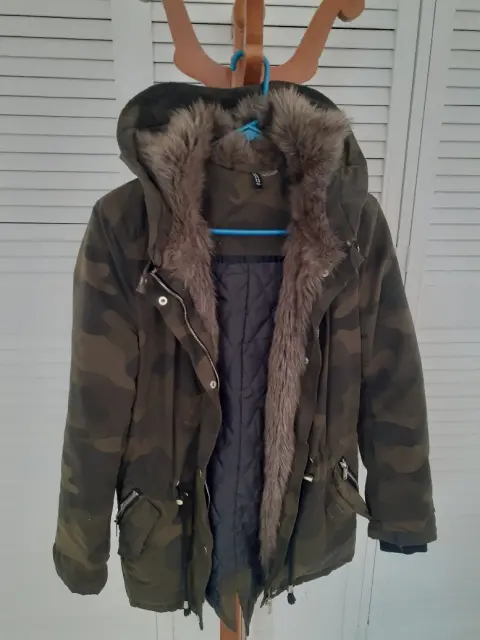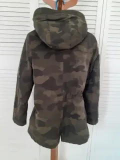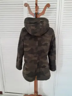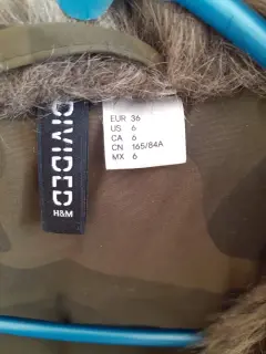Chamarra militar H&M. Chamarra militar H&M con gorro y frente forrada de Peluche, color verde militar con manchas, cómoda, calientita corte moderno hermoso, talla 6 combinable con todos los colores.